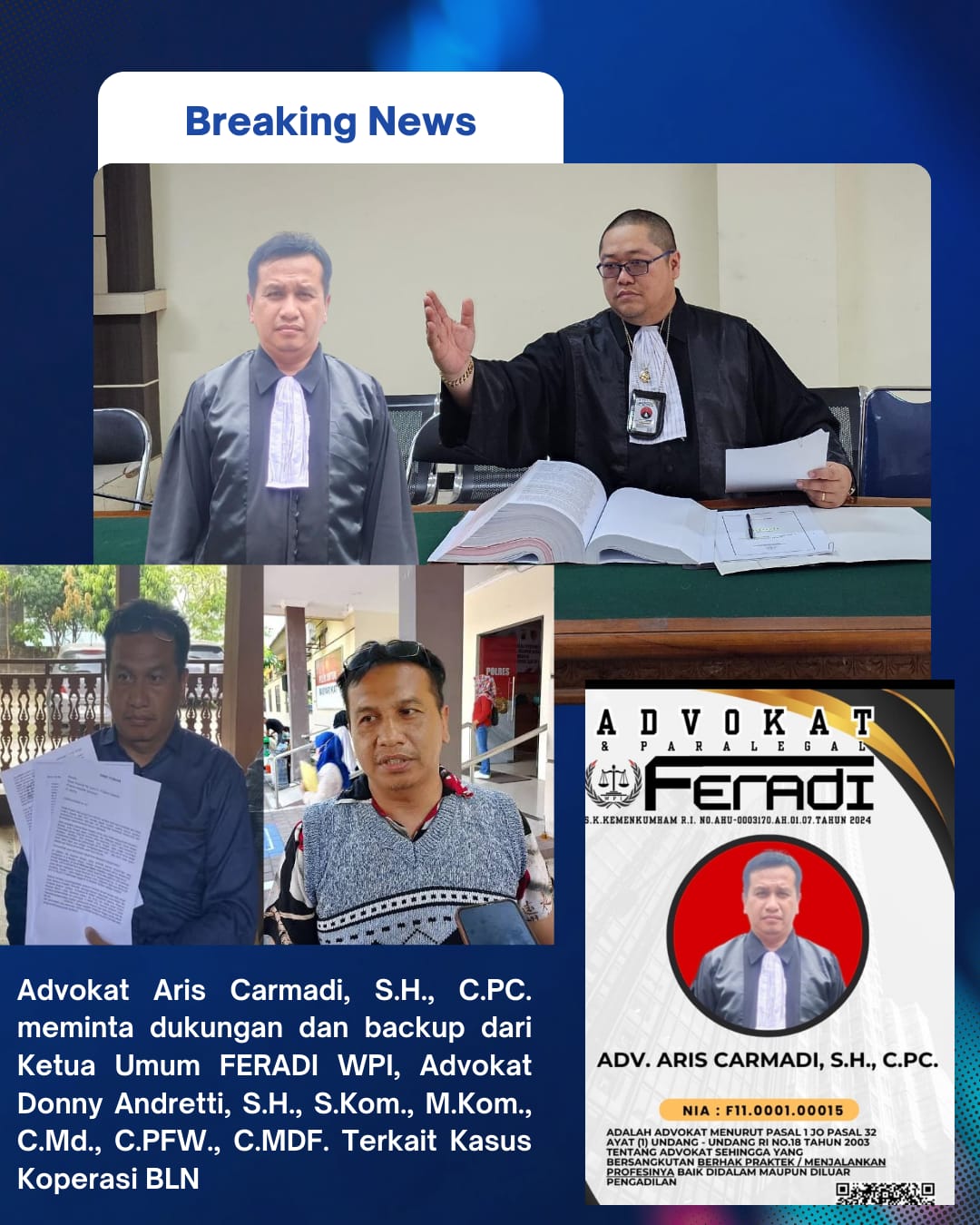 KARANGANYAR – DELIKKASUS86.COM – Adv. *Aris Carmadi, S.H., C.PC.*, selaku Koordinator dan Kuasa Hukum para korban Koperasi Bahana Lintas Nusantara (BLN), secara resmi meminta dukungan dan backup dari Ketua Umum FERADI WPI, *Advokat / Pengacara Donny Andretti, S.H., S.Kom., M.Kom., C.Md., C.PFW., C.MDF.*