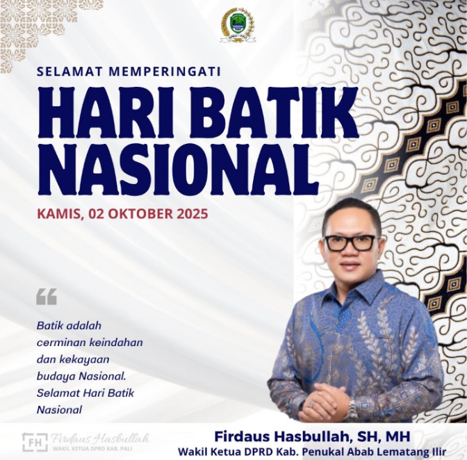 “Selamat memperingati Hari Batik Nasional 2025 Mari masyarakat untuk terus menjaga, melestarikan,dan mengembangkan batik sebagai jati diri bangsa,”pungkas Wakil Ketua DPRD Pali Firdaus Hasbulah SH MH (02/10/2025).