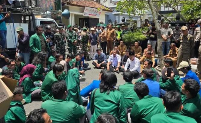 Bupati Tulungagung, H. Gatut Sunu Wibowo, S.E., M.E., menemui ratusan mahasiswa yang menggelar aksi unjuk rasa di depan Gedung DPRD Tulungagung pada Senin (29/9/2025). Bupati Gatut Sunu didampingi Sekda Tulungagung, H. Drs. Tri Hariadi, serta jajaran Forkopimda.