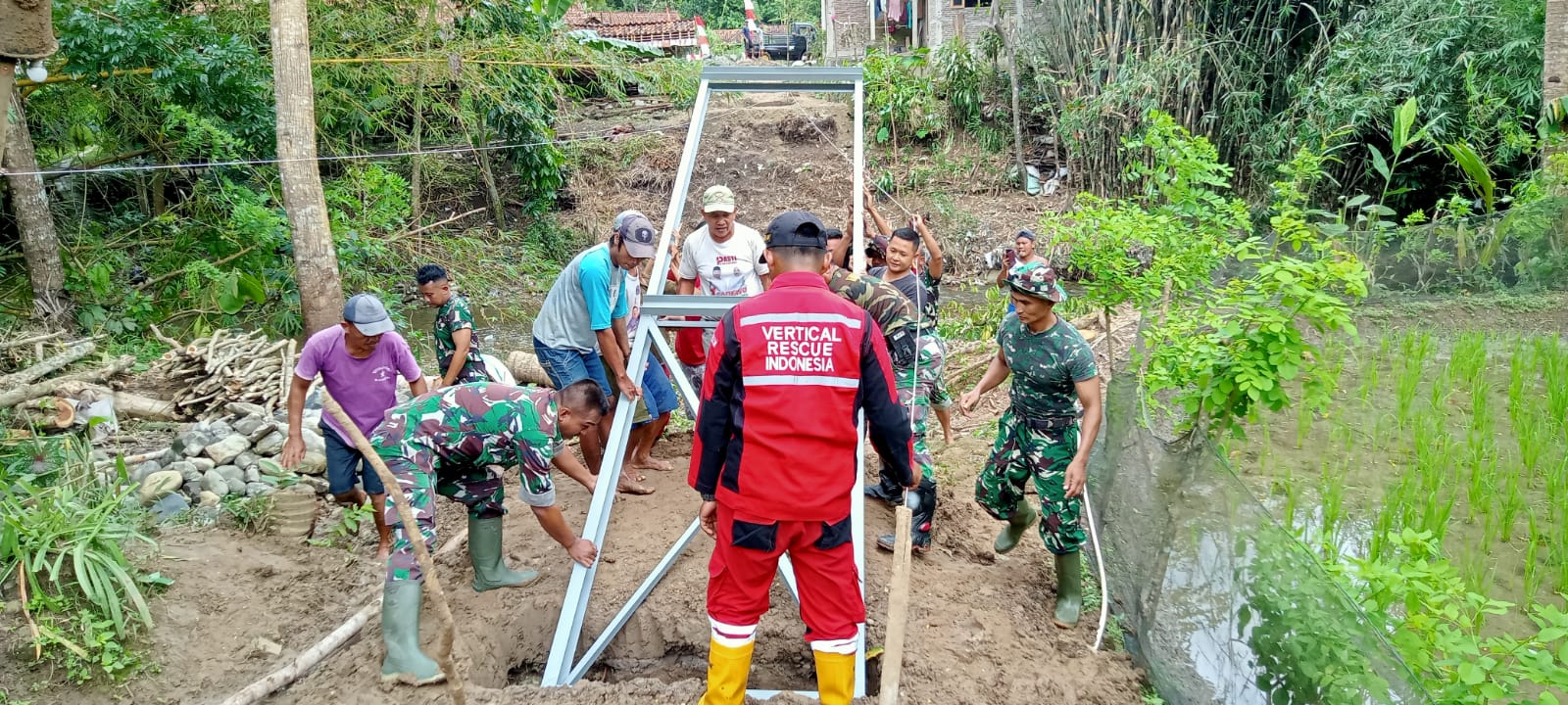 BANYUMAS Jateng,delikkasus86.com– Suara cangkul yang menghantam tanah berpadu dengan gemericik air sungai yang mengalir tenang di Desa Kalibagor, Kecamatan Kalibagor. Di RT 01 RW 03, pagi yang cerah menjadi saksi bagaimana harapan mulai dibangun dari tepian sungai. Prajurit Kodim 0701/Banyumas berdiri berdampingan dengan perangkat desa dan masyarakat, merintis pembangunan Jembatan Gantung Perintis Garuda.