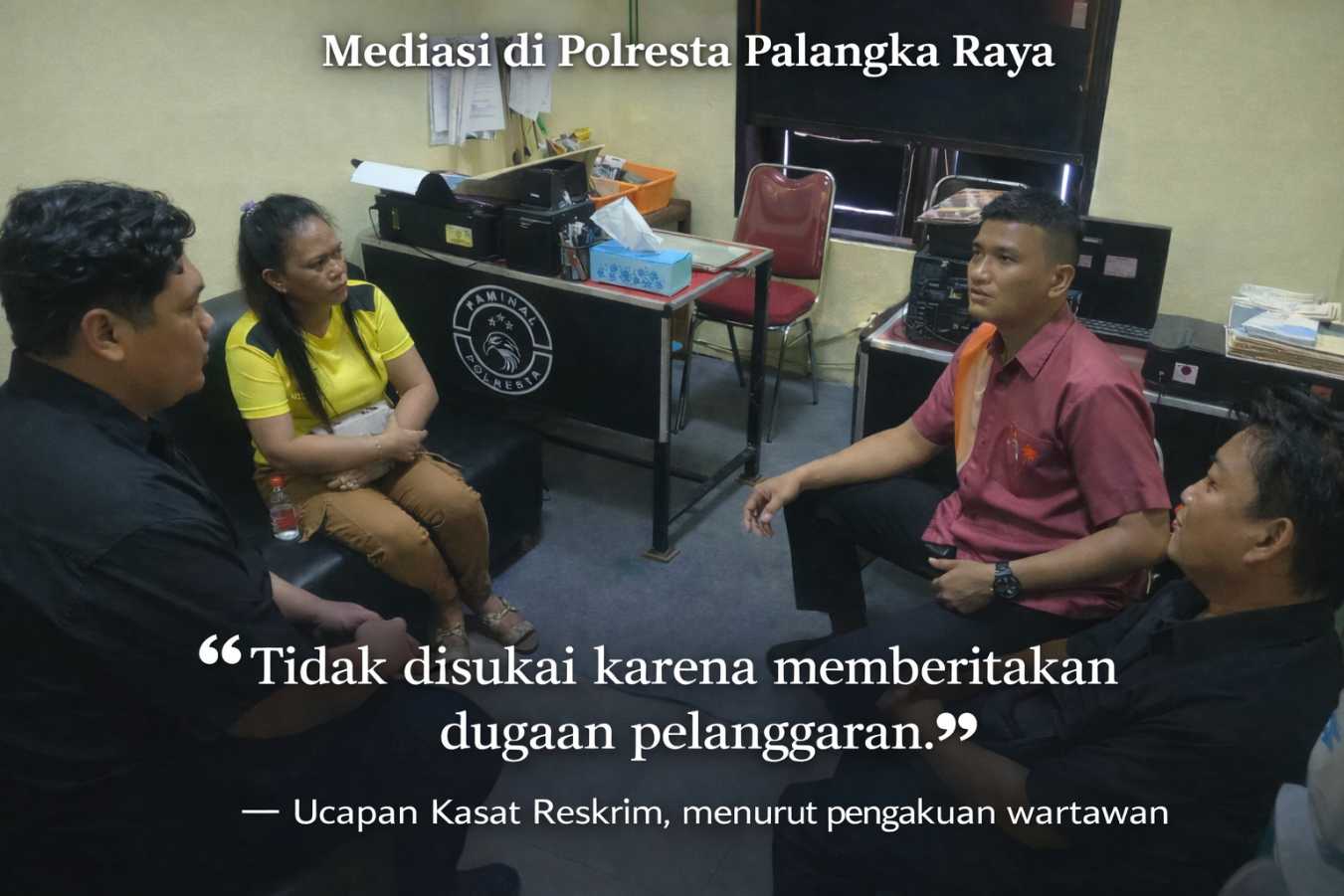 Namun, setibanya di ruangan tersebut, wartawan mengaku langsung merasakan suasana yang tidak kondusif. Uluran tangan yang diberikan disebut tidak disambut, disertai tatapan sinis dari Eka Palti. Sementara dua anggota Paminal dipersilakan duduk, wartawan tersebut mengaku dibiarkan berdiri tanpa dipersilakan duduk dalam beberapa waktu.