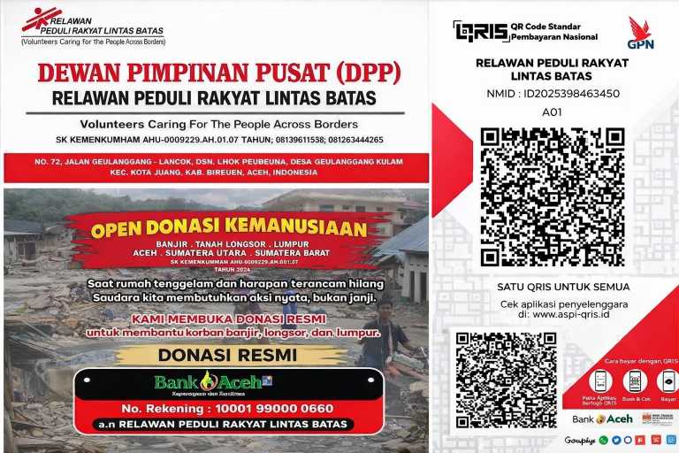 Adapun bentuk bantuan yang dapat disalurkan oleh masyarakat meliputi bahan pokok sembako, pakaian bekas layak pakai, serta donasi uang tunai. Donasi uang dapat dikirimkan melalui rekening resmi lembaga atas nama Relawan Peduli Rakyat Lintas Batas di Bank Aceh dengan Nomor Rekening 10001990000660, maupun melalui QRIS resmi lembaga dengan NMID: ID2025398463450.