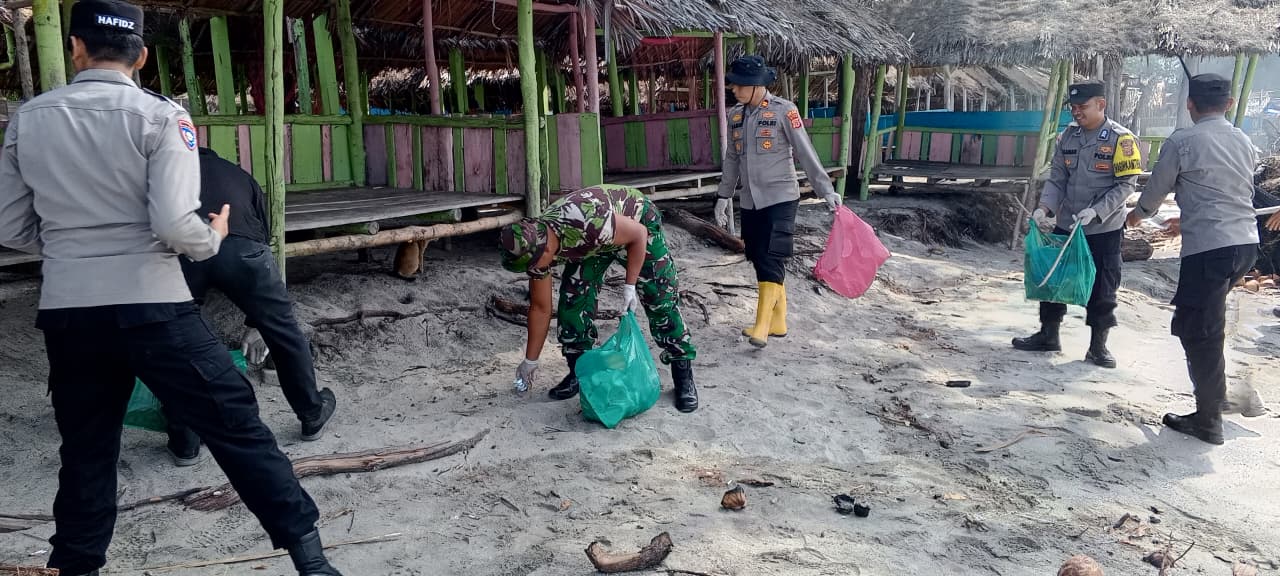 Kegiatan tersebut melibatkan personel Polres Aceh Singkil, anggota TNI, aparatur pemerintah daerah, serta warga sekitar yang secara bersama-sama membersihkan sampah plastik, ranting kayu, dan limbah lainnya yang berserakan di sepanjang bibir pantai.