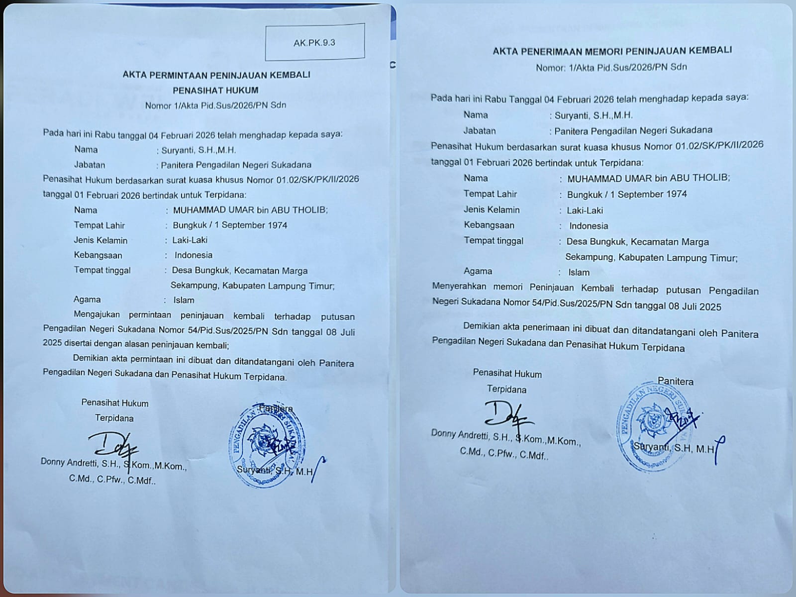 Lampung Timur — Tim kuasa hukum dari Subur Jaya Lawfirm – FERADI WPI secara resmi mengajukan upaya hukum luar biasa Peninjauan Kembali (PK) atas nama terpidana M. Umar Bin Abu Tholib ke Mahkamah Agung Republik Indonesia melalui Pengadilan Negeri Sukadana, Lampung Timur, Rabu (4/2/2026).