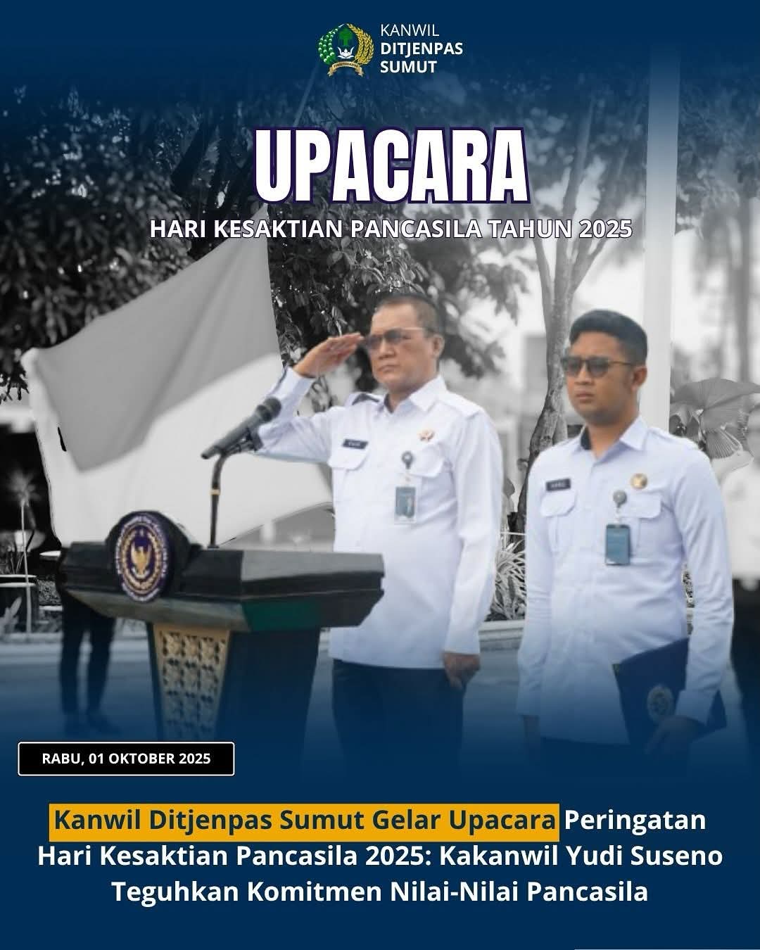 MEDAN delikkasus86.com – Kantor Wilayah Direktorat Jenderal Pemasyarakatan (Kanwil Ditjenpas) Sumatera Utara hari ini menggelar Upacara Peringatan Hari Kesaktian Pancasila Tahun 2025 dengan khidmat, pada Rabu, 01 Oktober 2025.