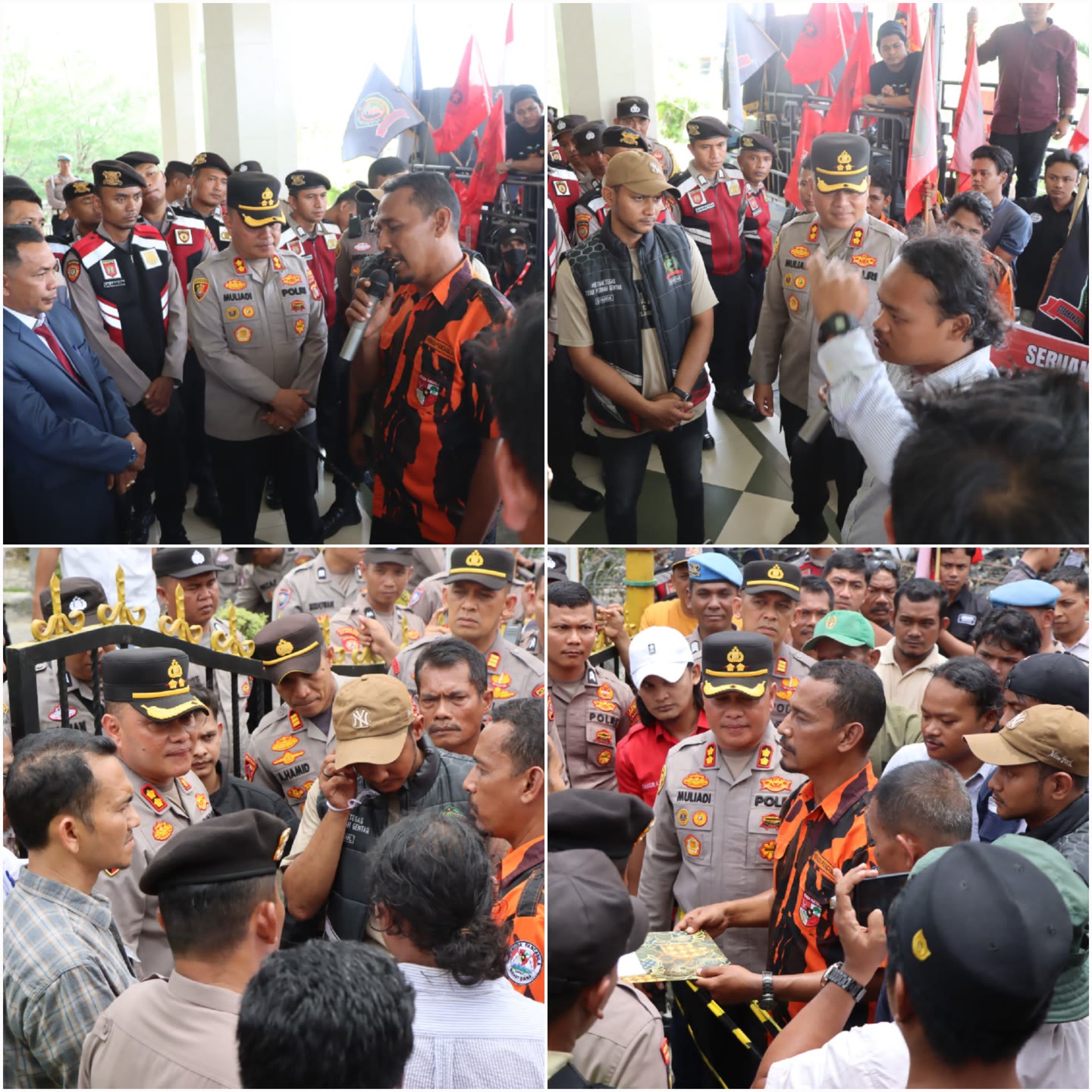 terlihat Kapolres Aceh Tamiang hadir di tengah tengah ratusan massa aksi dan personel polri yang melaksanakan pengamanan.