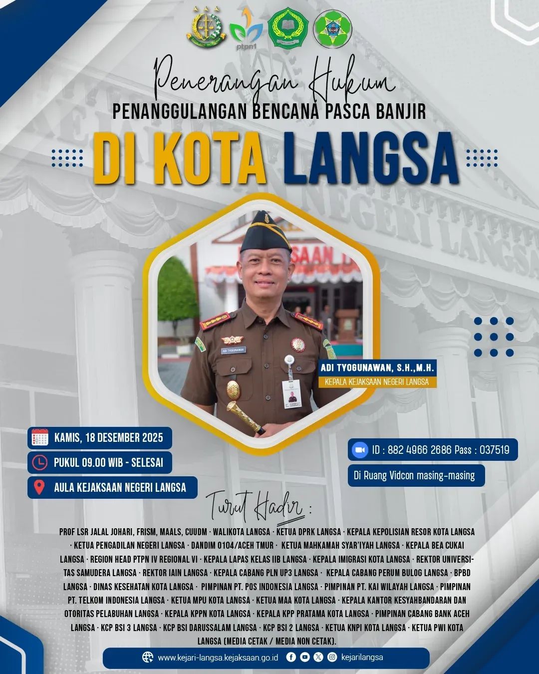lain Walikota Langsa, Jeffry Sentana S. Putra, S.E., Kepala Kejaksaan Negeri Langsa, Adi Tyogunawan, S.H., M.H., Sekretaris Daerah Kota Langsa, Ketua DPRK Langsa, unsur TNI dan Polri, pimpinan lembaga peradilan, instansi vertikal, BUMN/BUMD, perbankan,
