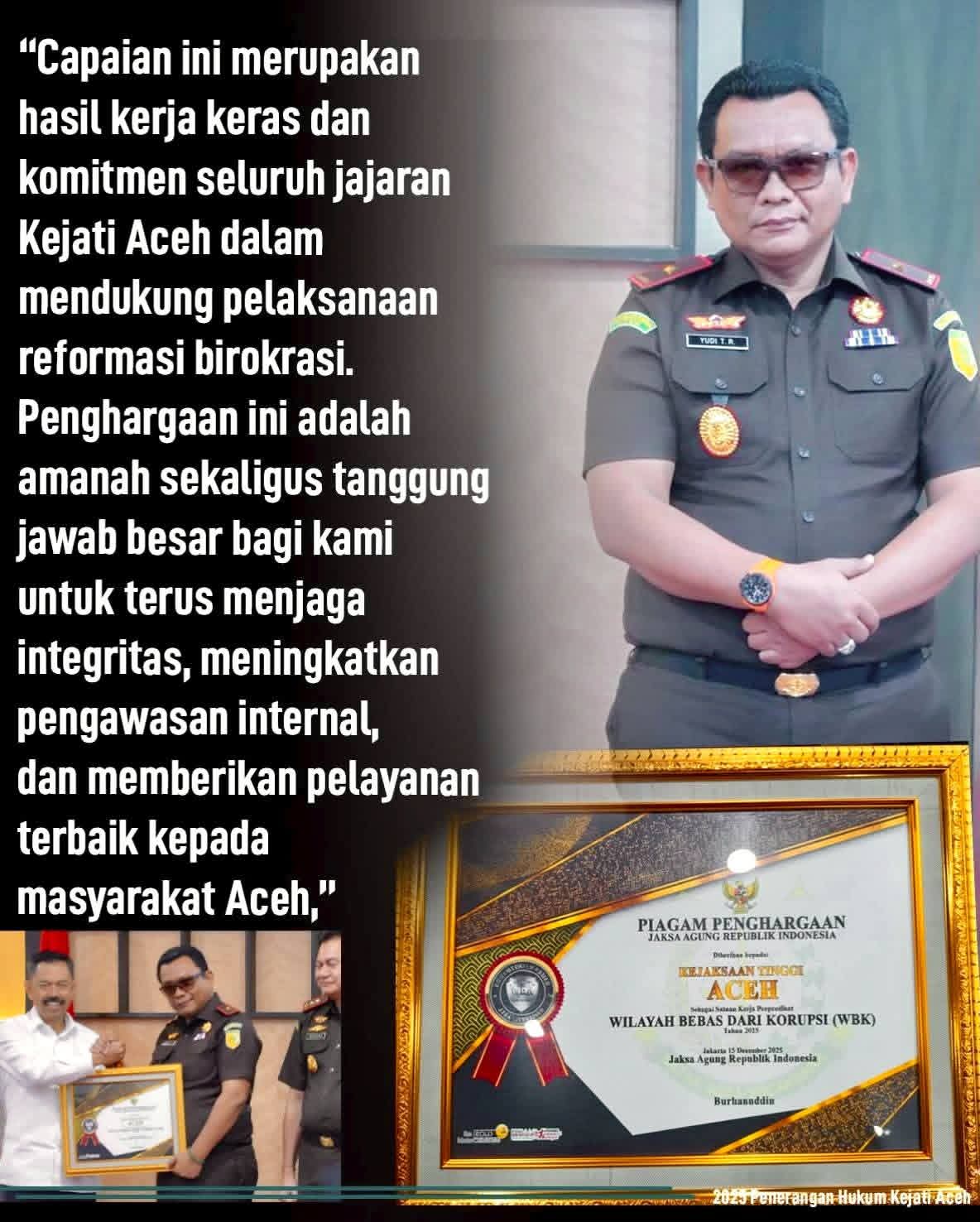 “Penghargaan ini adalah amanah sekaligus tanggung jawab besar bagi kami untuk terus menjaga integritas, meningkatkan pengawasan internal, dan memberikan pelayanan terbaik kepada masyarakat Aceh,” ujar Kepala Kejaksaan Tinggi Aceh.
