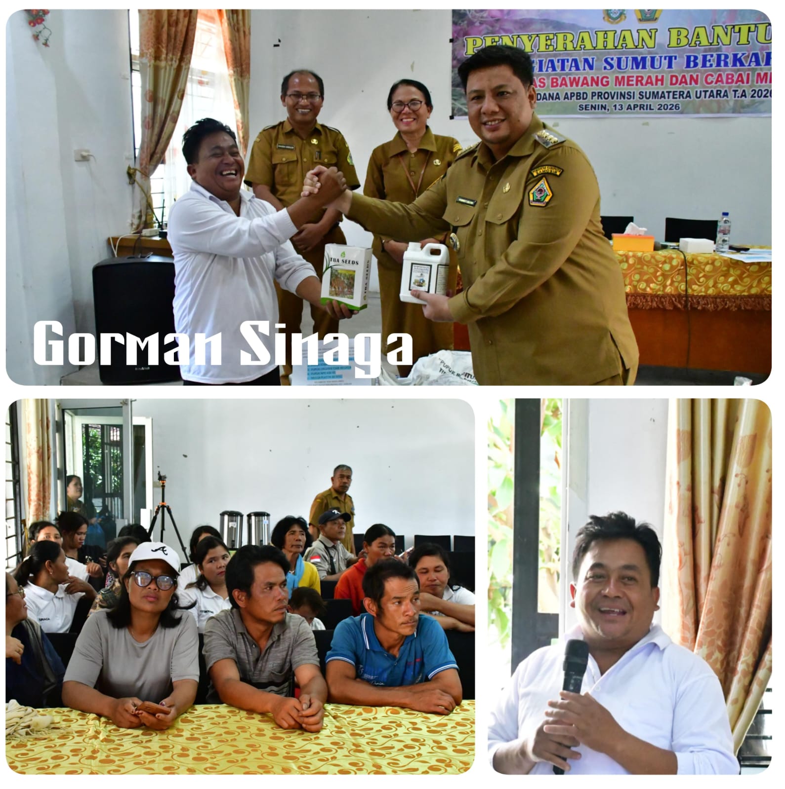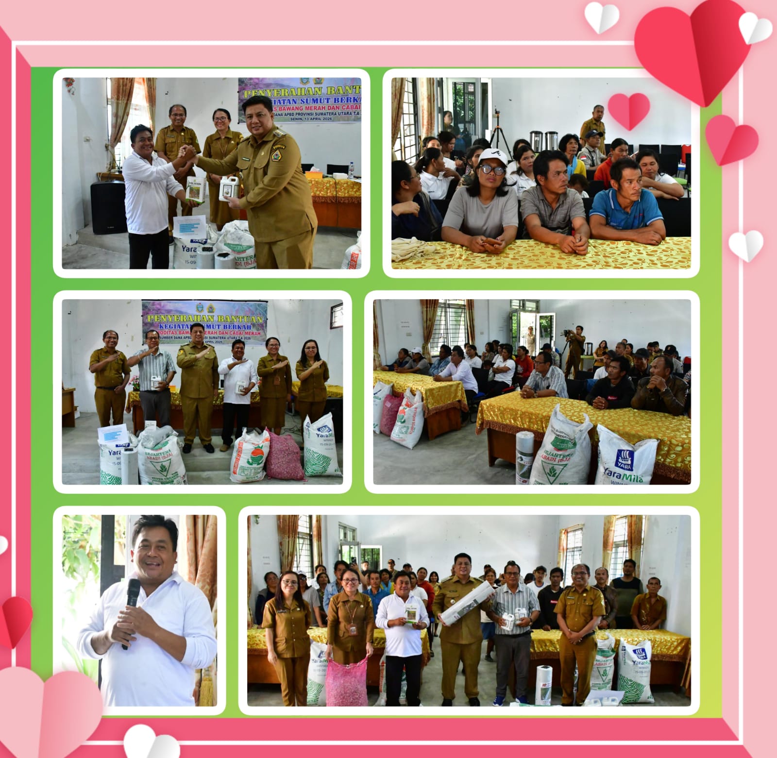 Upaya kolaborasi antara Pemerintah Kabupaten Samosir dan Pemerintah Provinsi Sumatera Utara melalui program Sumut Berkah mulai dirasakan manfaatnya oleh petani yang langsung diserahkan Oleh Bapak Bupati Samosir Vandiko Timotius Gultom ST bersama Kepala Dinas Ketapang dan Pertanian Samosir Tumiur br Gultom kepada kelompok tani di Aula Dinas Ketahanan Pangan, Pertanian dan Perikanan, Senin 13/4/2026 pukul 12.00.wib.