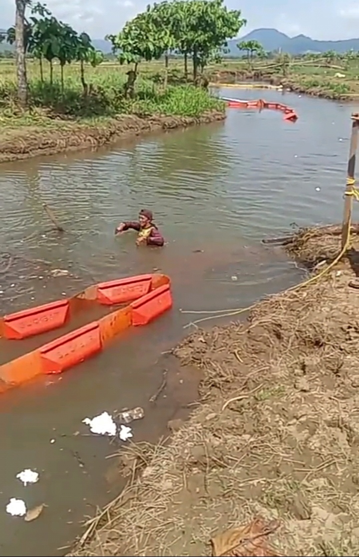 “Katanya rembesan minyak sudah aman, makanya kami buka semua. Kalau memang sudah aman, kenapa air masih ditahan dan penghalau minyak masih dipasang di sungai?” tambah warga lain yang enggan disebutkan namanya