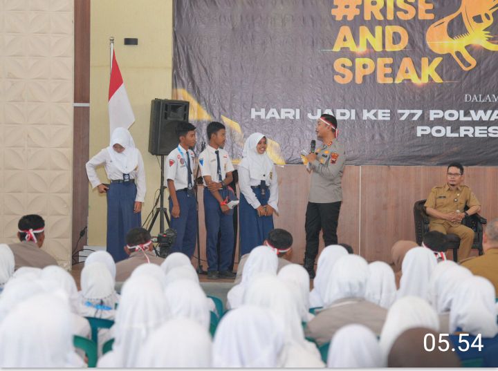 Acara bertema “Raise and Speak” dengan tagar #BeraniBicaraSelamatkanSesama ini dihadiri ratusan siswa SMP, jajaran pejabat Polres, serta perwakilan PGRI, MKKS, dan FKKS.