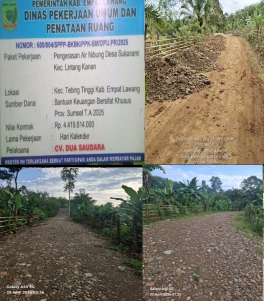 DELIKKASUS86. COM || EMPAT LAWANG – Proyek pembangunan infrastruktur di Kabupaten Empat Lawang kembali memicu polemik besar. Pekerjaan Pengerasan Jalan Air Nibung, Desa Sukarami, Kecamatan Lintang Kanan, yang didanai melalui Bantuan Keuangan Bersifat Khusus Provinsi Sumsel T.A 2025, diduga kuat menjadi ladang manipulasi anggaran melalui pengurangan volume bangunan secara masif.