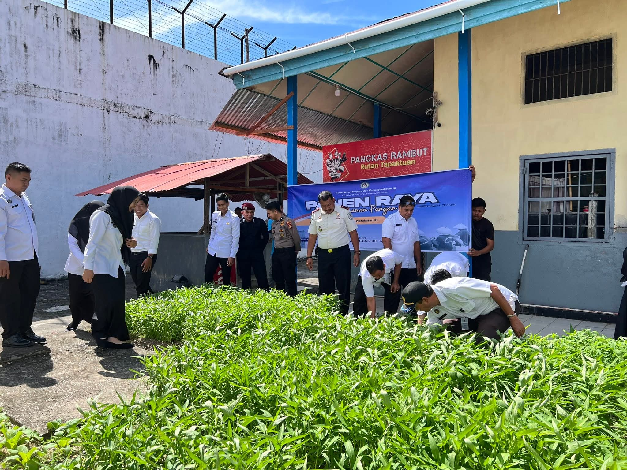 Selepas mengikuti acara pembuka melalui Zoom, seluruhnya langsung bergerak ke lahan ketahanan pangan Rutan Tapaktuan yang berlokasi di dalam blok hunian untuk melaksanakan panen raya sayuran Kangkung dan Sawi.