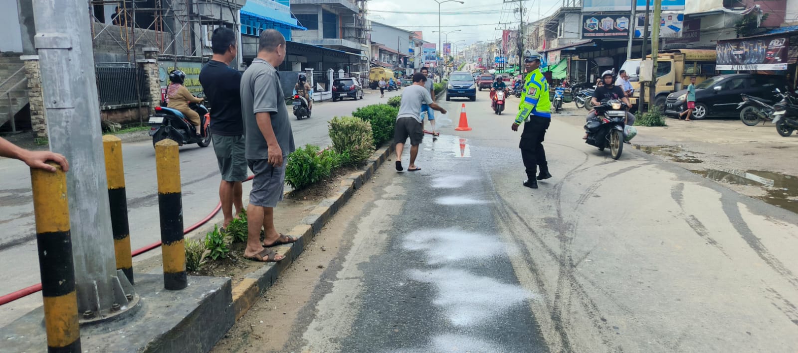 Polres Melawi Polda Kalbar Respon dan gerak cepat Satuan Lalu Lintas Polres Melawi bersama Badan Sosial Pencegahan Bahaya Kebakaran (BS-PBK) Nanga Pinoh terjun langsung ke lapangan atas informasi dari masyarakat tentang adanya tumpahan Bahan Bakar Minyak jenis solar dari truck tangki Crude Palm Oil (CPO) di perempatan Tugu Juang Nanga Pinoh, Senin (15/09/25).
