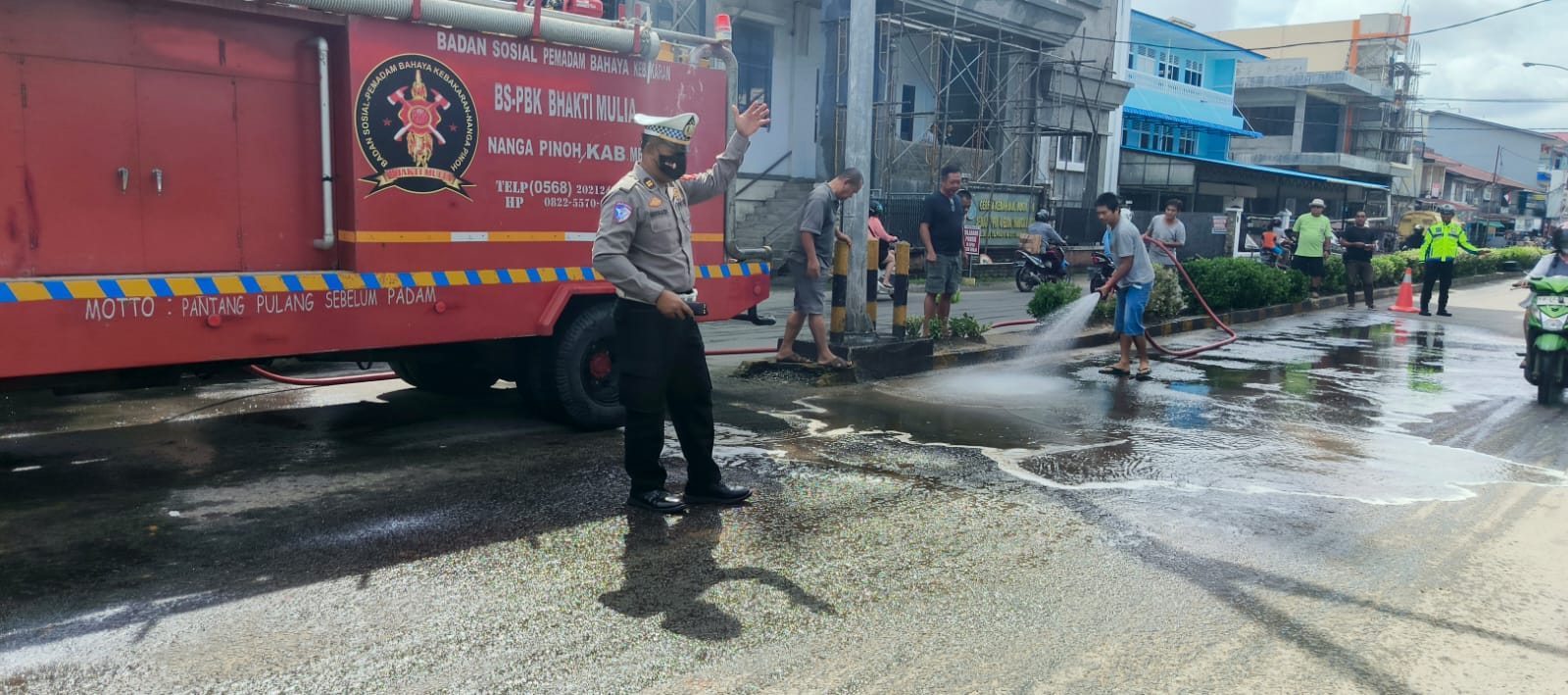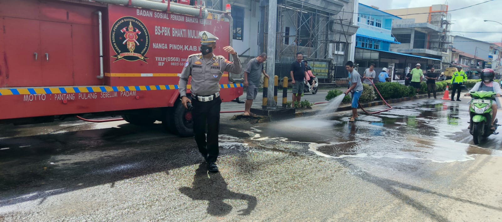 “Melakukan pengaturan lalu lintas dan bersama personel BS-PBK Nanga Pinoh melakukan penyiraman dan pembersihan bersama serta memastikan jalan aspal telah bersih dan tidak membahayakan pengguna jalan,” terang Iptu J.E.Kusuma.