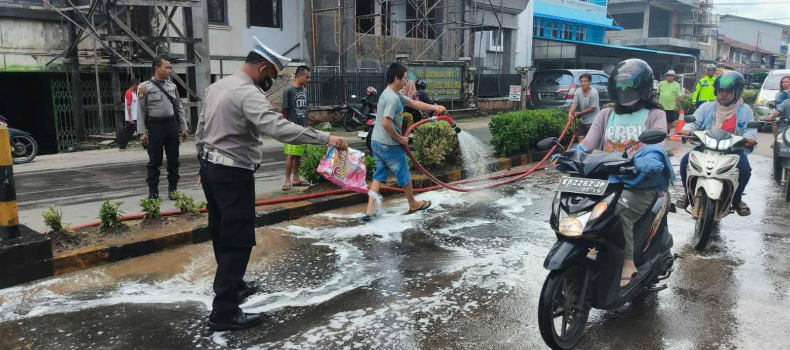 “Bersama kami melakukan penyiramanan dan pembersihan dengan cara di semprot air dan cairan detergen guna membersihan tumpahan solar yang dapat membahayakan pengguna jalan,” ujar Kasat Lantas.