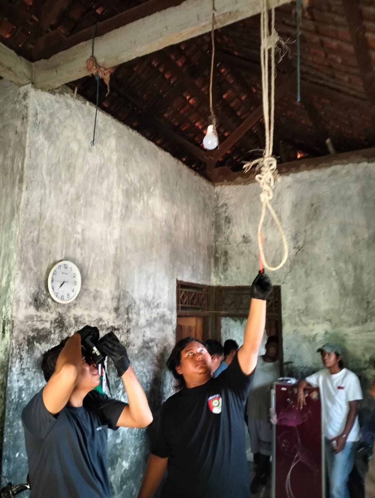 Dari hasil olah TKP, petugas menemukan sejumlah barang yang diduga berkaitan dengan peristiwa tersebut, diantaranya tali tambang nilon berwarna putih sepanjang sekitar 3,1 meter yang masih terikat pada balok beton, serta sebuah drum plastik berwarna putih yang diduga digunakan sebagai pijakan, dan pada leher korban juga ditemukan bekas jeratan.
