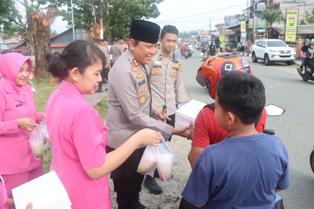 Paket takjil dibagikan kepada pengendara roda dua, roda empat, serta masyarakat yang melintas maupun warga sekitar yang hendak berbuka puasa. Antusiasme masyarakat terlihat saat menerima takjil yang dibagikan secara langsung oleh Kapolres bersama Ketua Bhayangkari dan jajaran.