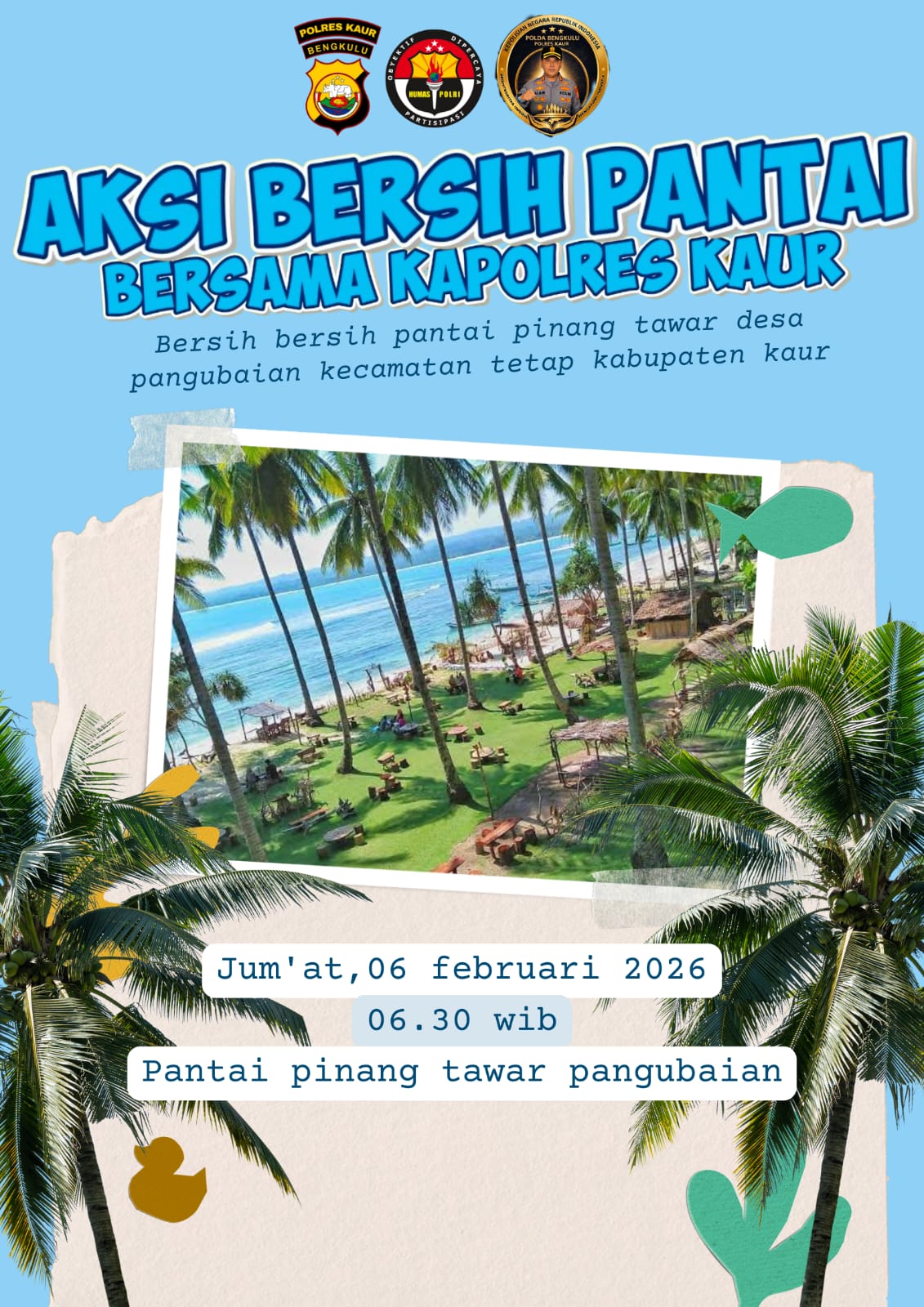 KAUR BENGKULU – Polres Kaur akan melaksanakan kegiatan Aksi Bersih Pantai bersama TNI dan masyarakat di kawasan wisata Pantai Pinang Tawar, Desa Pengubaian, Kecamatan Tetap, Kabupaten Kaur, pada Jumat (06/02/2026) pukul 06.30 WIB.