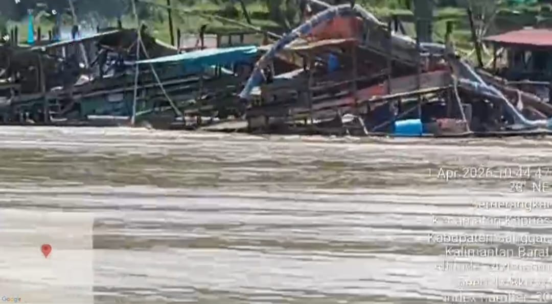 Berdasarkan pantauan di lapangan pada Rabu-01-April 2026, Sejumlah lanting dan peralatan tambang terlihat beroperasi di badan sungai.