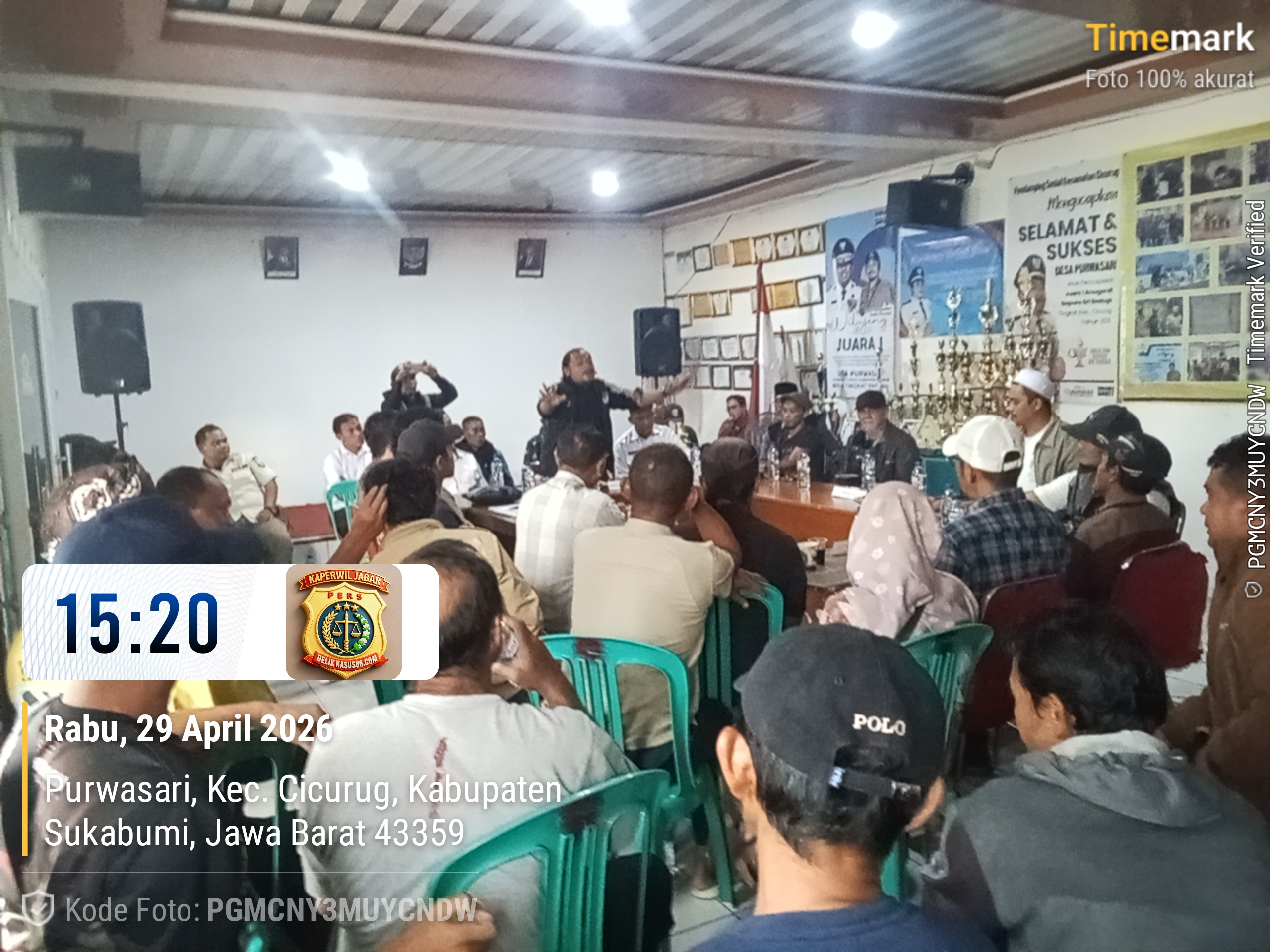 Delikkasus86.com|`Sukabumi – Sejumlah warga Desa Purwasari, Kecamatan Cicurug, Kabupaten Sukabumi, menggelar aksi orasi dan menyampaikan tuntutan terkait bau menyengat yang diduga berasal dari proyek peternakan sapi di wilayah tersebut. Kegiatan ini berlangsung di Kantor Desa Purwasari dan difasilitasi oleh aparat kepolisian setempat, Babinsa, serta Kepala Desa Purwasari, pada hari Rabu